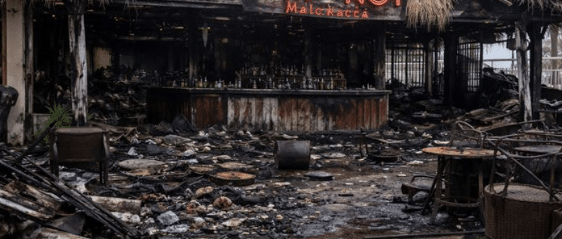 Nach Auffassung der Staatsanwaltschaft sollen mehrere Beschuldigte vom Hotelbalkon aus brennende Zigarettenstummel sowie alkoholische Flüssigkeiten auf das leicht entflammbare Schilfdach der Bar geworfen haben. Dieses fing daraufhin Feuer und löste den Großbrand aus.