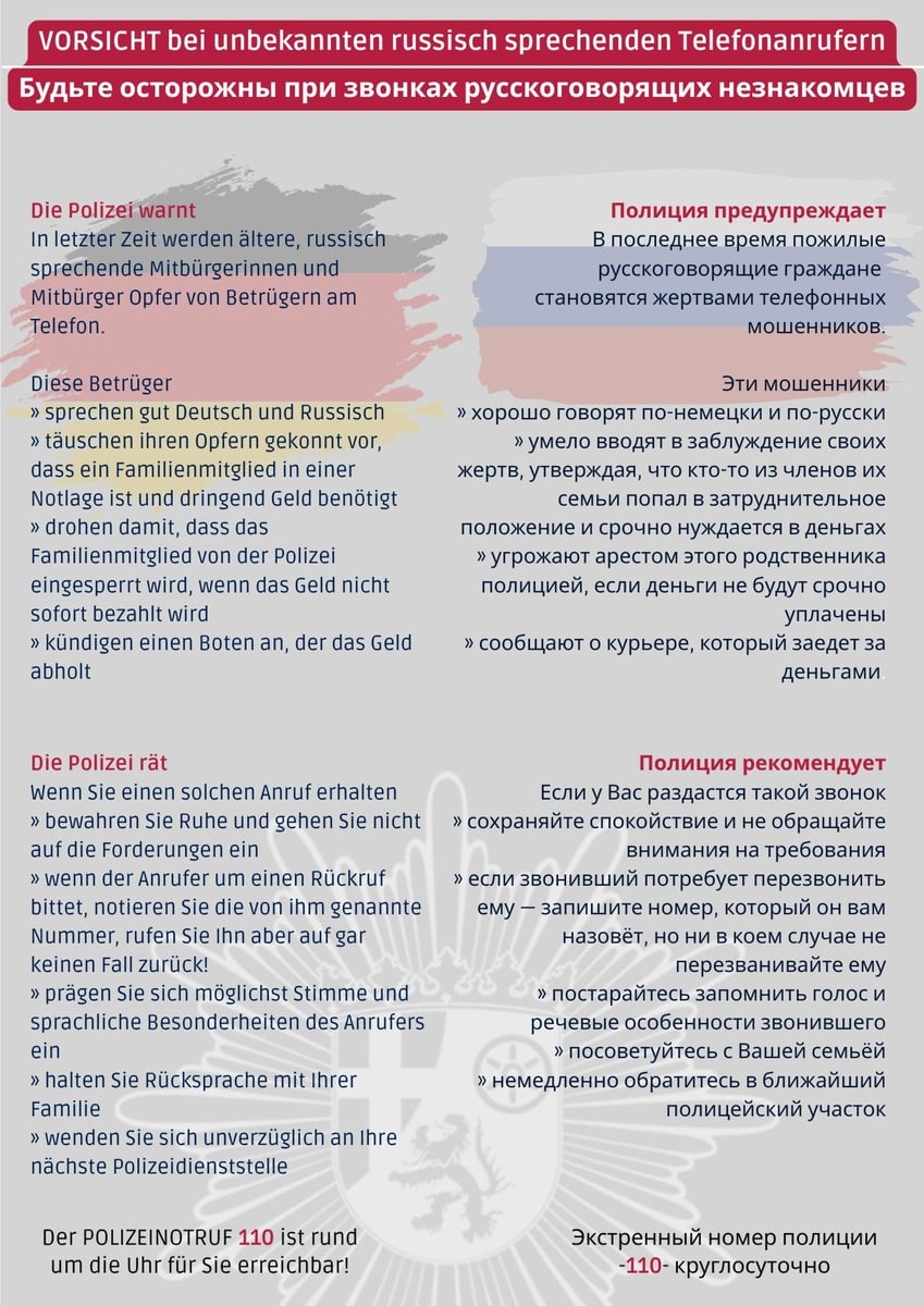 Sprechen Sie insbesondere mit älteren Familienmitgliedern über diese Betrugsmasche. Gerade russischsprachige Seniorinnen und Senioren benötigen besondere Aufmerksamkeit, da sie gezielt angesprochen werden. Aufklärung kann helfen, finanzielle Schäden und psychische Belastungen zu verhindern.