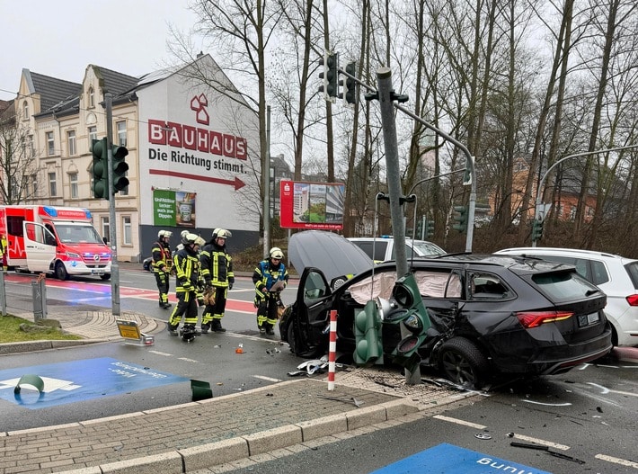 Aus bislang ungeklärter Ursache kollidierten zwei Pkw miteinander. Durch die Wucht des Aufpralls beschädigten die Fahrzeuge zusätzlich einen Ampelmast. Als die Feuerwehr an der Unfallstelle eintraf, hatten alle Beteiligten ihre Fahrzeuge bereits selbstständig verlassen.
