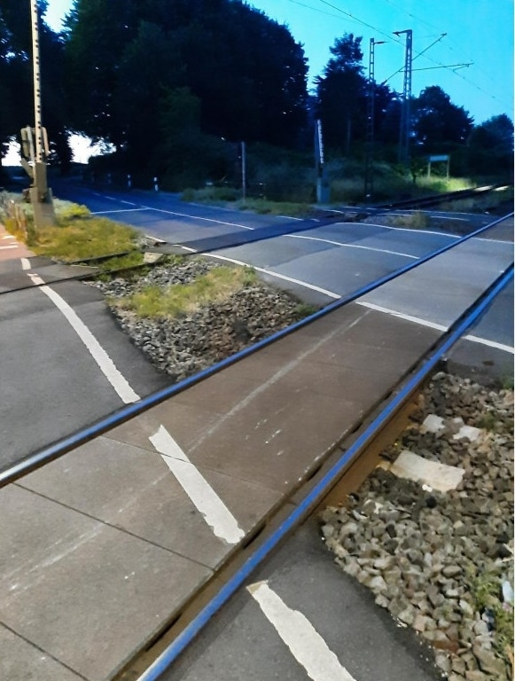 Redaktionshinweis: Der Wagen wurde völlig zerstört. Es blieben nur Metallstreben übrig, die als Fotomotive nicht geeignet sind. Das anliegende Foto zeigt die Schleifspuren auf dem Bahnübergang, der von einer zusätzlichen Personenschranke am Fußweg gesichert ist.