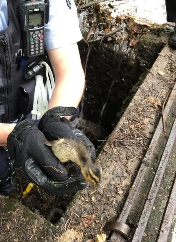 Weder die Entenmama noch das lautstarke Quieken der Kleinen half ihnen aus ihrer misslichen Lage. Zum Glück erkannte eine Spaziergängerin das Dilemma und alarmierte die Polizei. Ein Streifenteam der Wache Herne machte sich sofort auf den Weg, um die Tiere zu retten. Mit vollem Körpereinsatz rückten die Beamten das Gitter zur Seite und kletterten in den Schacht hinein. Vorsichtig hob ein Beamter die verängstigten Küken aus diesem heraus. Alle sieben Küken kamen mit dem Schrecken davon und konnten unversehrt mit ihrer Mama vereint werden.