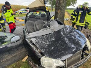 Ein 25-jähriger Autofahrer aus Fredenbeck verlor auf regennasser Fahrbahn die Kontrolle über seinen VW Polo. Der Wagen schleuderte in einer Kurve, kam nach rechts von der Fahrbahn ab und prallte frontal gegen einen Baum.