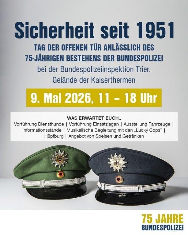Die Bundespolizei Trier lädt am Samstag, 9. Mai 2026, zum großen Tag der offenen Tür ein. Anlass ist das 75-jährige Bestehen der Bundespolizei. Die Veranstaltung findet auf dem Gelände der Kaiserthermen statt und bietet von 11 bis 18 Uhr ein vielfältiges Programm für Besucherinnen und Besucher jeden Alters.