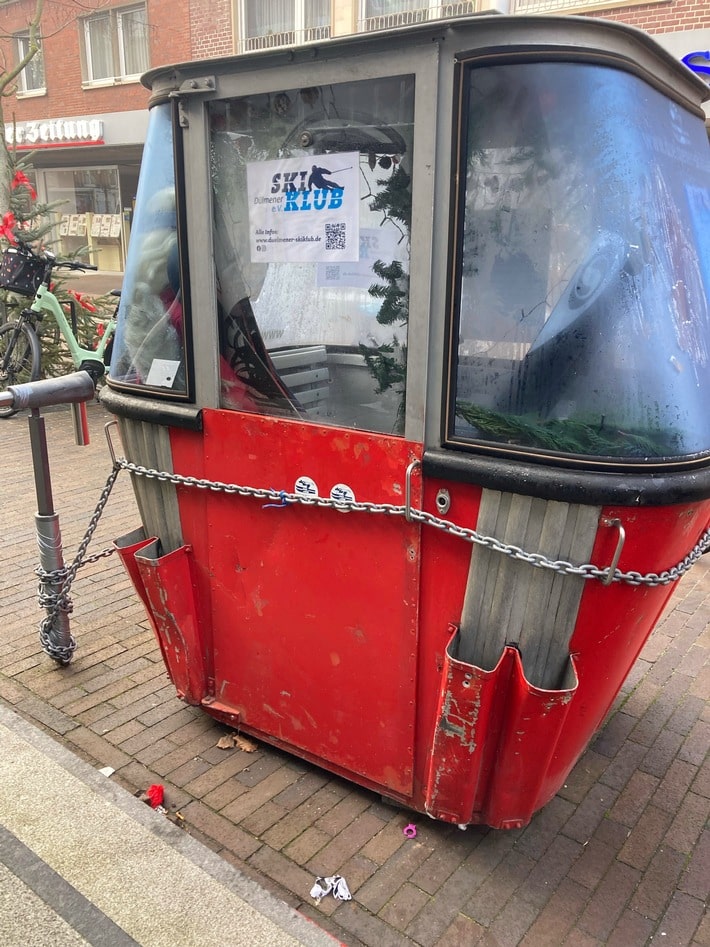 Die betroffene Ski-Seilbahn-Kabine stand zu Dekorationszwecken vor der Eisbahn auf dem Weihnachtsmarkt und diente als Blickfang für Besucher.