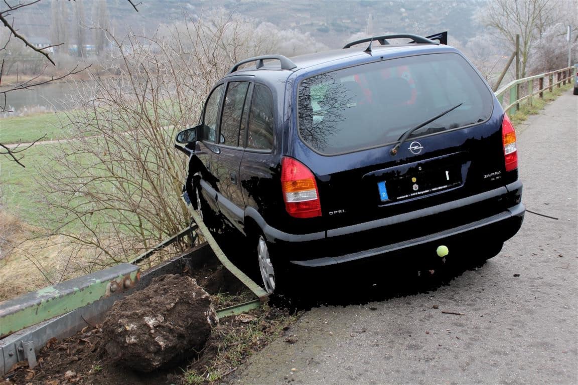 Am 22.01.2020 um 10:30 Uhr verlor ein die B 49 von Niederfell nach Dieblich befahrender 51-jähriger Mann aus ungeklärter Ursache die Kontrolle über seinen Pkw. Dabei stieß er gegen die rechts gelegene Weinbergsmauer und wurde nach links abgelenkt, wo er in das moselseitige Geländer stieß und dieses durchbrach. Glücklicherweise stürzte der Opel nicht auf das mehrere Meter darunter liegende Gelände, der Fahrer wurde leichtverletzt in ein Krankenhaus verbracht. Für die Dauer der Unfallaufnahme und der Bergung des Fahrzeugs blieb die B 49 für etwa eine Stunde gesperrt